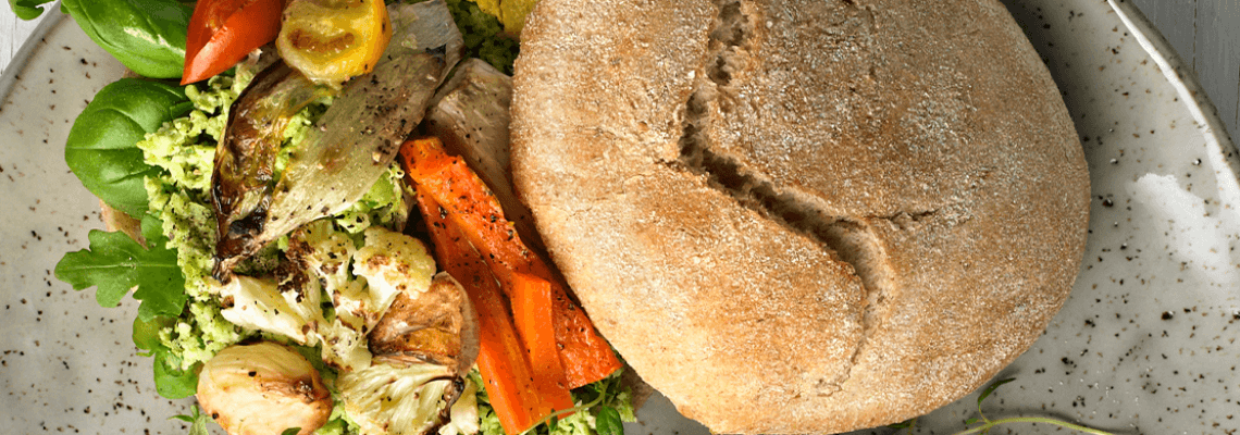Vegansk sandwich med grønn hummus og grønnsaker.